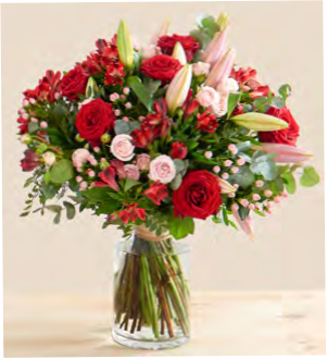 Bouquet premium dans les tons rouge et rose avec lys et roses.
